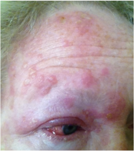 Figura 1: Herpes zoster em topografia de ramo V1 do nervo trigêmeo. (Fonte: https://commons.wikimedia.org/wiki/File:Day05_shingles_or_Herpes_Zoster_Virus_attacking_forehead_and_eye.jpg#/media/Fi